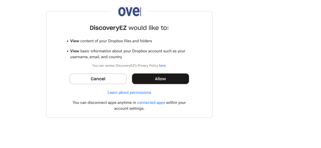 - You will see a screen asking to allow DiscoveryEZ to access Dropbox.